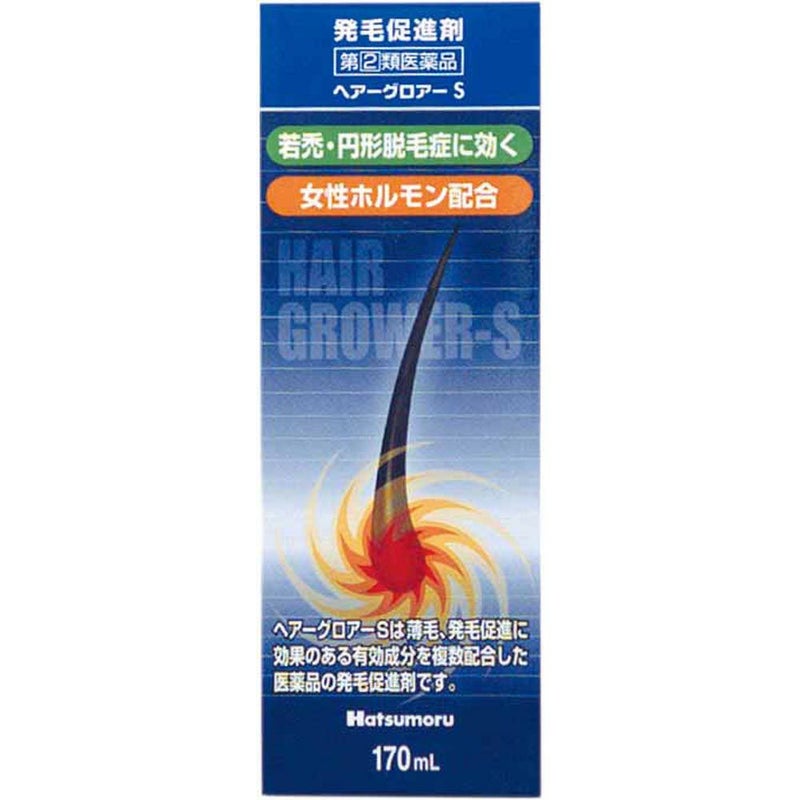 商品説明文ハツモーツ・ヘアグロアーSはエストラジオール安息香酸エステル(女性ホルモン)を含む9種の有効成分の総合的な働きにより,若禿,生え際の薄毛,円形脱毛症,粃糠性脱毛症の他,発毛促進,育毛,脱毛の予防に効果を発揮する医薬品の発毛促進剤です。