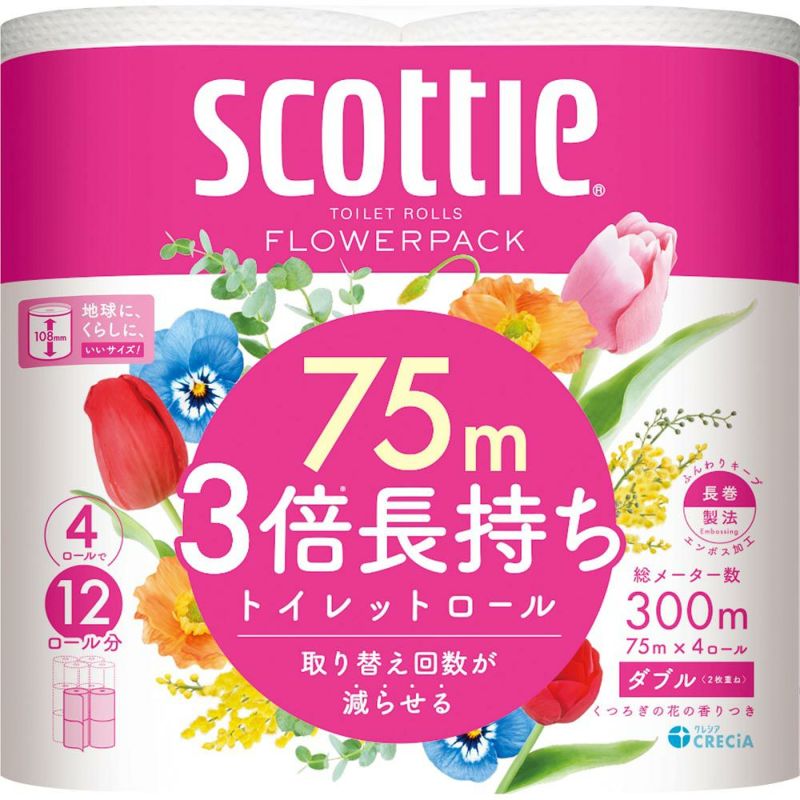 4ロールで12ロール分の長尺ロール スコッティフラワーパック3倍長持ち