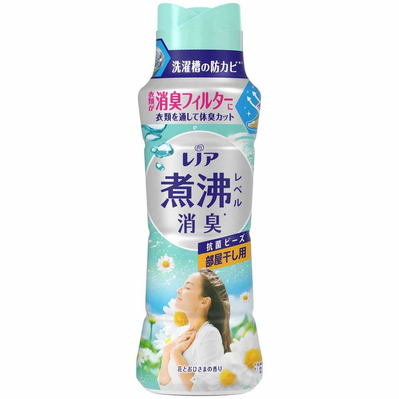 衣類を通して体臭カット!煮沸レベル消臭の消費者評価が非常に高かったため商品名とパッケージも併せて大改良を実施。 レノア煮沸消臭抗菌ビーズ部屋干し花とおひさま