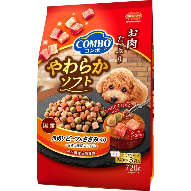 お肉たっぷり、おいしいやわらかタイプのフード。 コンボドッグやわらかソフト角切りビーフ・ささみ野菜